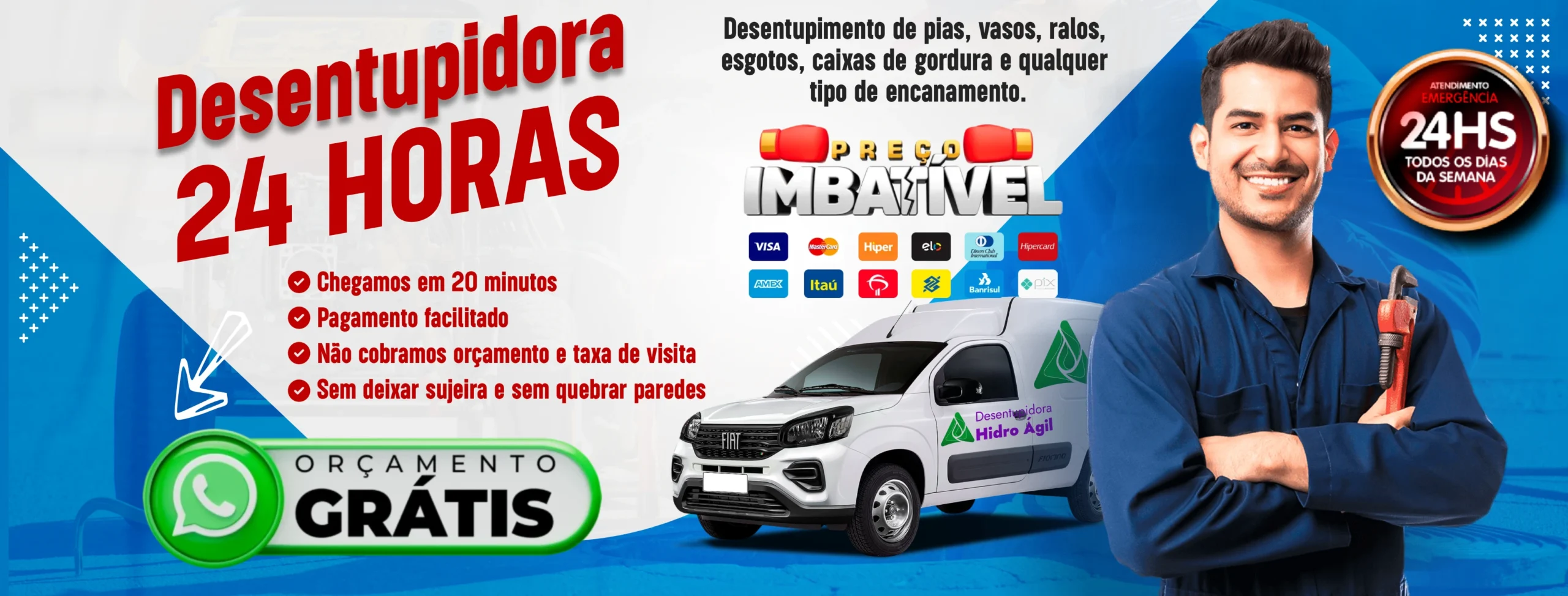 Atendemos 24 horas por dia, 7 dias por semana, pois entendemos que problemas de entupimento podem ocorrer a qualquer momento.